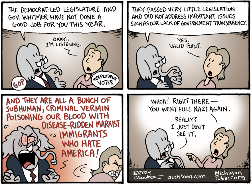 Editor's note: John Auchter is a freelance political cartoonist. His views are his own and do not necessarily reflect those of Michigan Public, its management, or its license holder, the University of Michigan.