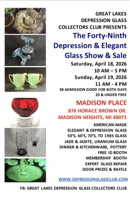 The Great Lakes Depression Glass Collectors Club presents our 49th Annual Depression & Elegant Glass Show & Sale to be held at Madison Place at 876 Horace Brown Drive in Madison Heights, Mi 48071.