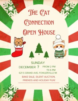 Join our Holiday Open House for jolly good FUNdraising - Gift wrapping station, Bake sale, Silent auction, Card making, treats, friends & more!! All proceeds help us keep Saving homeless MI cats. 501c3