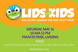 Lansing-area families are invited to Lids for Kids on Saturday, May 16, 10 am-12 pm at Frances Park, for a fun, educational bike safety event. Kids will receive a free, custom-fitted bike helmet, learn important safety tips, and enjoy games, activities, and character meet-and-greets.