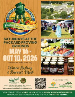 The Packard Farmers Market returns for the 2026 season at the Packard Proving Grounds Historic Site. Formerly the Shelby Farmers Market, the rebranded market runs Saturdays from May 16 through October 10, 2026, from 9:00 a.m. to 2:00 p.m.