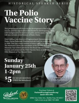 Join us at the Packard Proving Grounds Historic Site for the next installment in our Historical Speaker Series, The Polio Vaccine Story. Presented by Don Calliban, this thought-provoking program revisits a time when polio was one of the most feared diseases in the world—paralyzing thousands of children each year and sparking a desperate race for a cure.