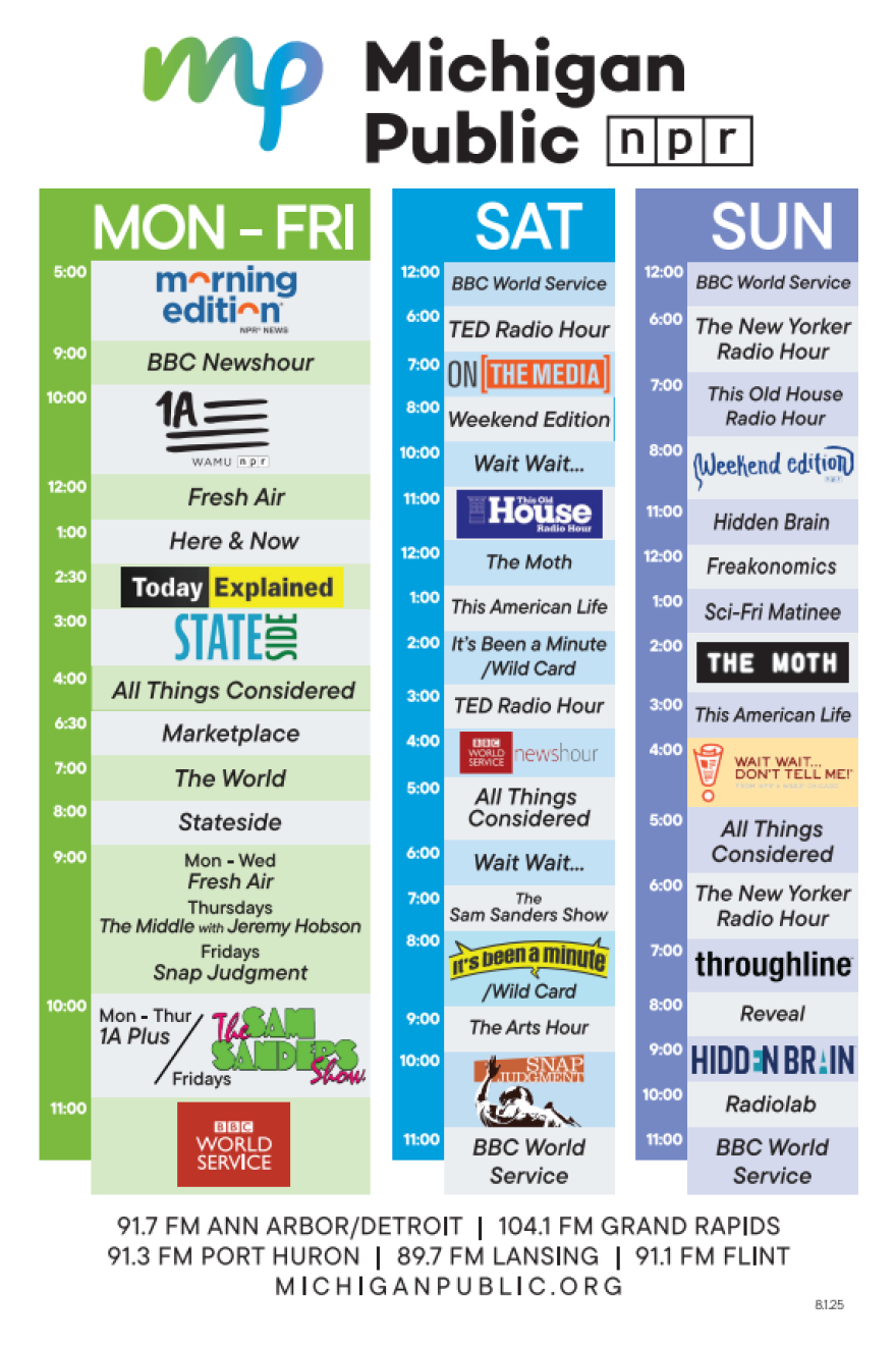 Michigan Public Program Director Matt Shafer Powell has announced that the station will be introducing an updated weekend programming schedule beginning Friday, August 15, 2025. The revised line-up will include several new shows including PRX’s The Sam Sanders Show airing Friday and Saturday evenings, American Public Media’s This Old House Radio Hour on Saturday and Sunday mornings, and BBC’s The Arts Hour on Saturday nights.